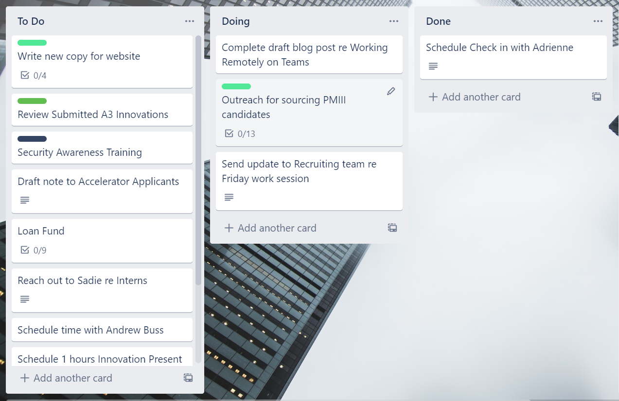 This is the board I keep outside my office. The backlog is like a giant inbox for all the ideas and projects that might happen someday. To Do is my prioritized list of items to take care of next, while Doing is where I capture my ‘big rocks’ for the week so anyone walking by knows what I’m working on on any given week. And nothing feels better than moving something to Done.